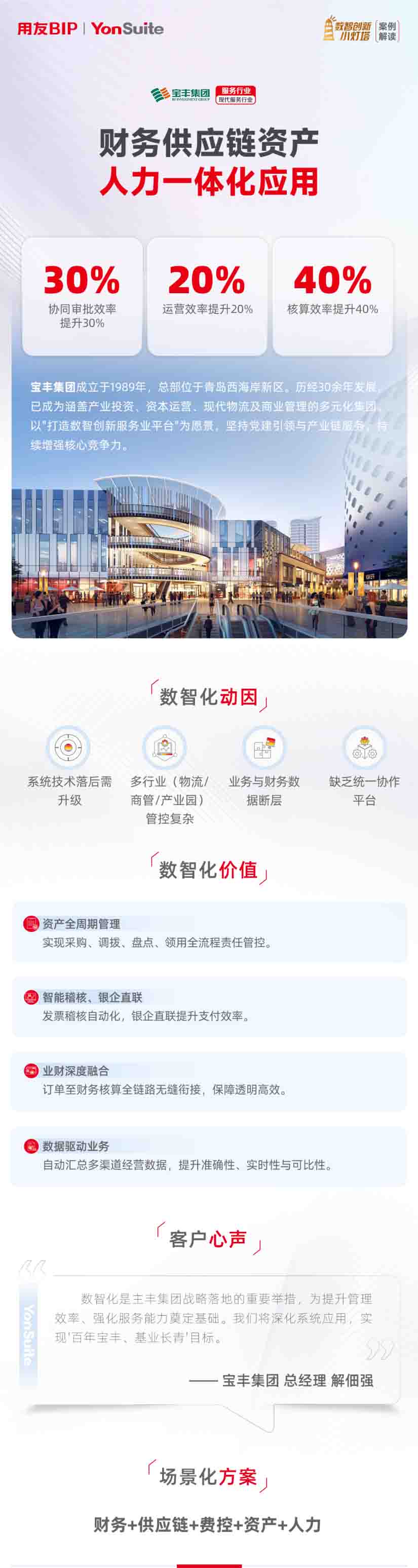 从物流的运输调度到产业园的招商运营,从商管的商户服务到集团的战略决策,YonSuite的 “五维一体” 平台就像一条无形的 “数据纽带”,将宝丰集团的多元业务串联成一个有机整体。这种 “整体大于部分之和” 的协同效应,正是服务业企业在激烈竞争中脱颖而出的关键。