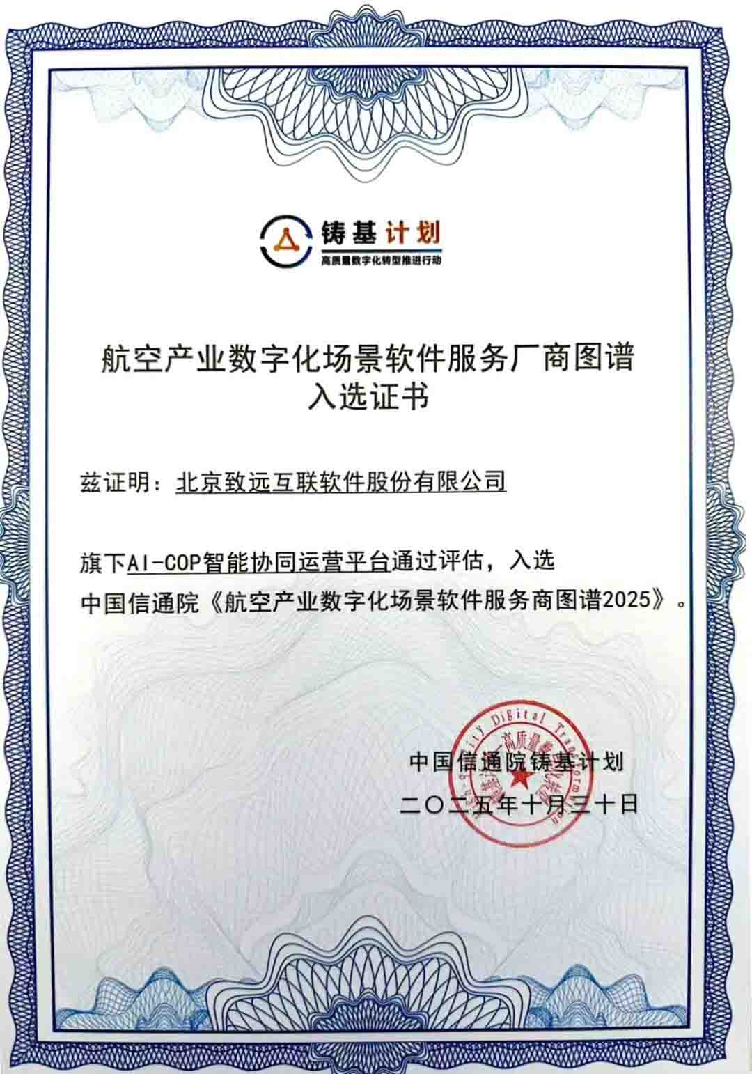 此次入选《航空产业数字化场景软件服务商图谱2025》,既是荣誉,更是责任。未来,致远将继续紧跟国家发展战略,深化航空与低空经济布局,加快核心技术攻关与场景创新,以AI-COP平台为核心引擎,联合产业链伙伴共建开放共赢的数字化生态,为中国航空事业迈向更高水平注入强劲的数字动能。