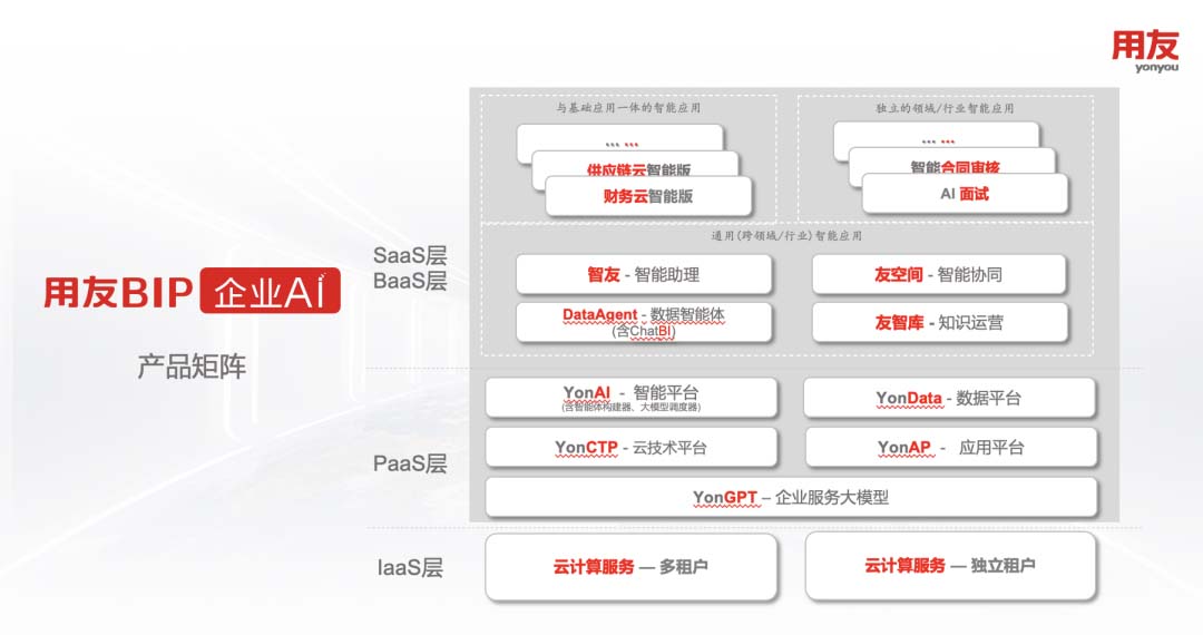 用友BIP企业AI产品矩阵包含IaaS、PaaS、BaaS/SaaS三层,从底层基础设施到上层应用,构建起完整的企业AI产品体系,为企业智能化转型提供全栈式、多场景的技术与应用支持。