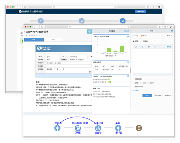 流程随时申请,移动快速审批,可加签、会签、知会和回退等,使移动审批更灵活方便。