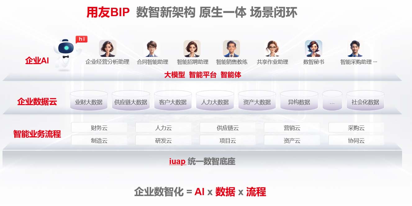 用友 BIP 超级版以统一数智底座打破信息壁垒,通过 “AI x 数据 x 流程” 一体化架构,提供端到端的一体化场景方案 ,众多智能体深度融入企业运营的核心环节,基于统一的流程和数据,驱动业务和管理智能化运营。
