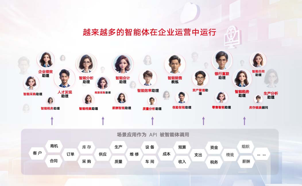 除了通用智能体之外,用友还针对企业不同的业务和管理领域推出了一批专业领域和行业的Agent,如智能会计助理、商旅报账助理、智能分析智能助理、人才发现助理等。这些智能体以自然语言的交互体验模式,帮助用户快速访问系统中的服务、数据、知识,高效率处理业务,驱动业务流程自动化、决策智能化。