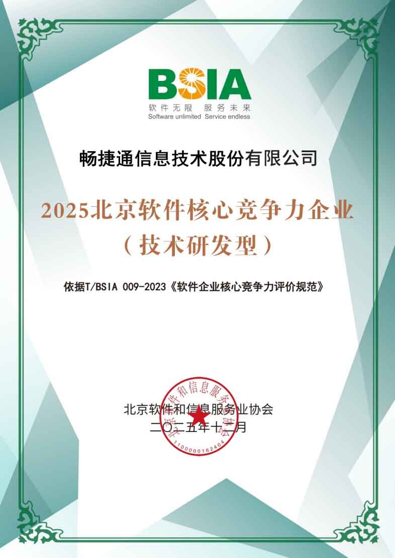 在报告发布的“2025北京软件企业核心竞争力企业”名单中,畅捷通信息技术股份有限公司凭借深厚的技术研发实力与持续创新能力,成功入选“技术研发型”企业榜单。