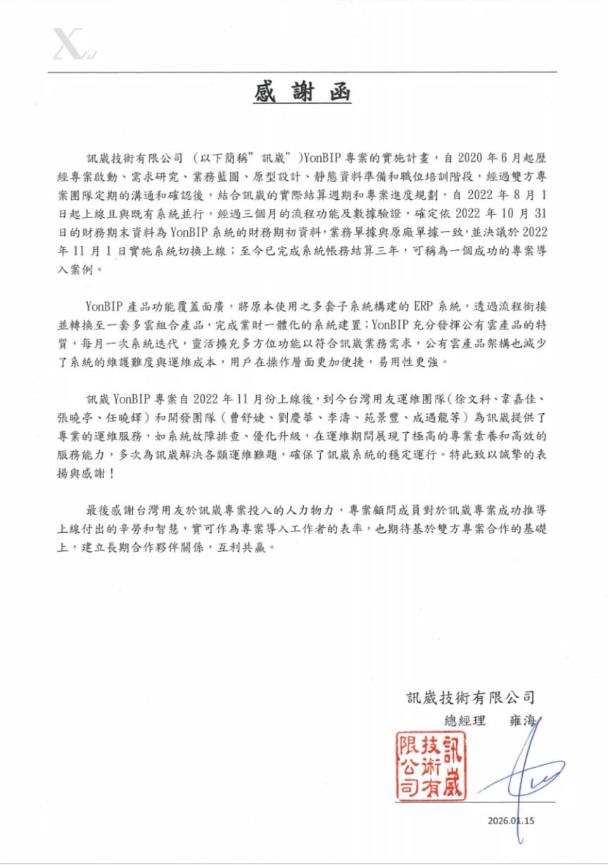 讯崴在感谢函中明确肯定用友台湾团队在运维期间展现的专业素养与高效服务能力,并对多次协助解决运维难题、确保系统稳定运行表达感谢。这份由客户主动发出的点名致谢,对内是台湾团队运维能力与原厂支持机制的成果验收;对外也传递出用友在系统替换后仍能提供长期、稳定、可持续的运维陪跑服务。