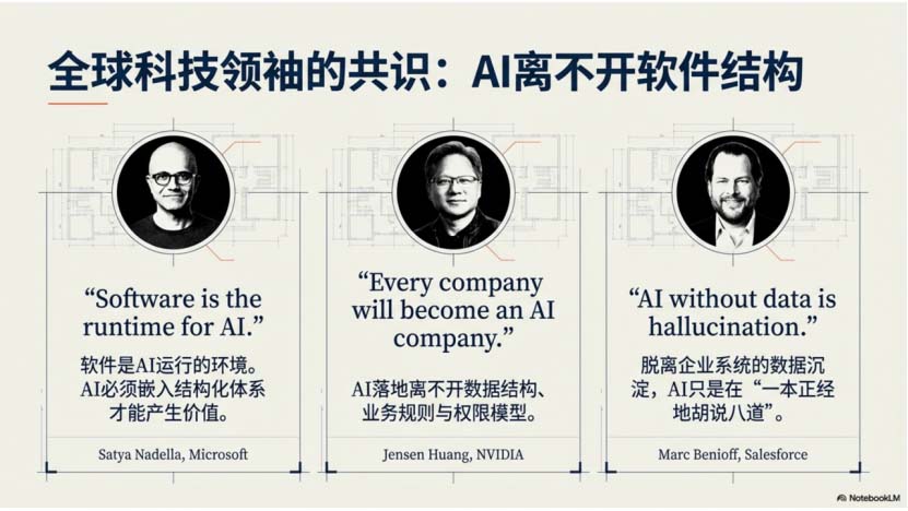 英伟达CEO黄仁勋强调“Every company will become an AI company.(每家公司都将成为AI公司)”,但他从未否定企业系统的价值。恰恰相反,AI的落地离不开数据结构、业务规则、权限模型、API接口、流程框架,这些全部来自企业软件平台。